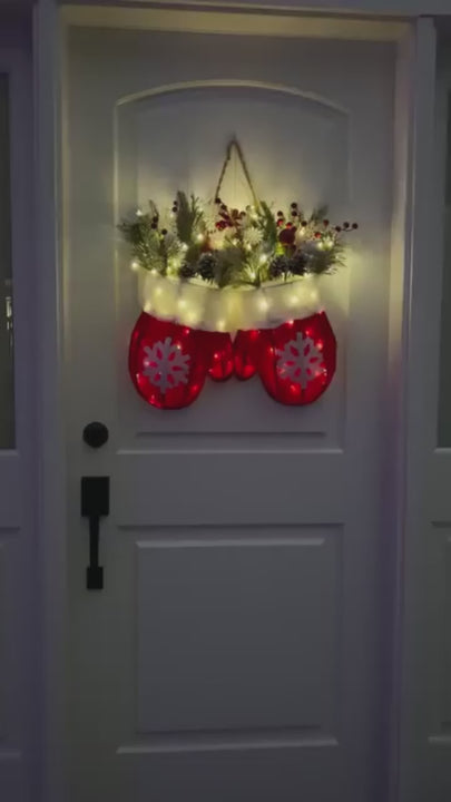 This is a pre-lit Christmas wreath designed to look like a pair of hanging mittens filled with festive greenery.